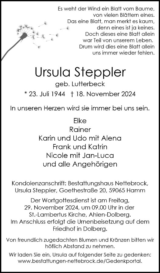 zum Tode von Ulla spreche ich euch mein herzliches Beileid aus. Möge die Zeit der Trauer sich schnell in eine Zeit der dankbaren Erinnerung wandeln. Das wünsche ich euch von Herzen.